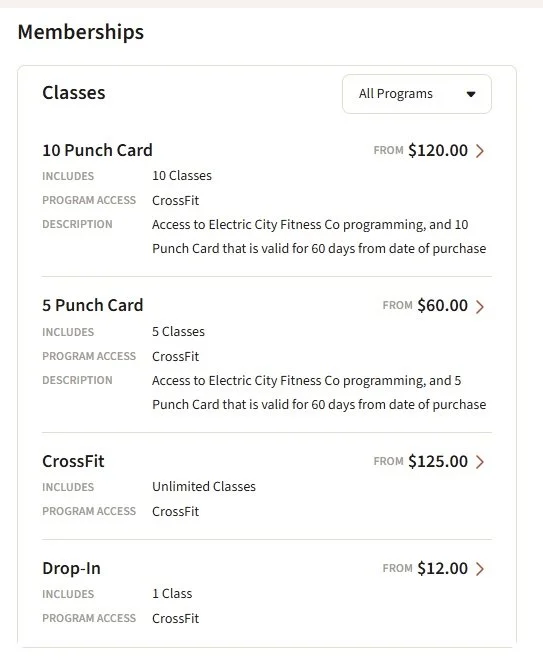 Select your best option (Drop in, punch card or monthly membership)